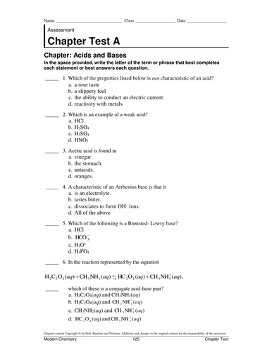 Printable Acids And Bases Test For Chemistry Grades 6 12