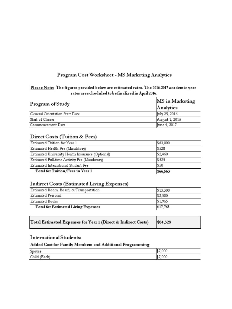 Program Cost Worksheet Marketing Analytics