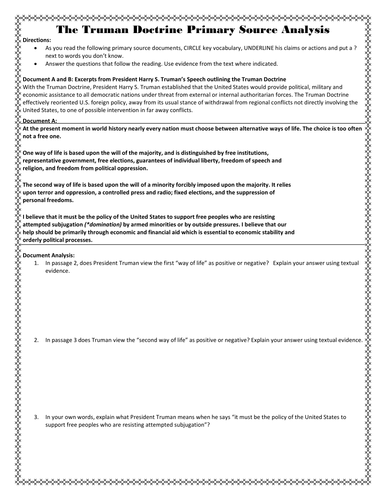 Truman Doctrine Primary Source Analysis Activity Teaching Resources